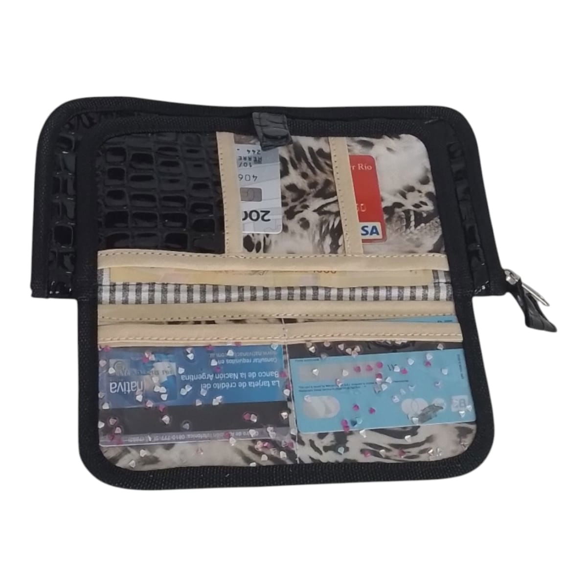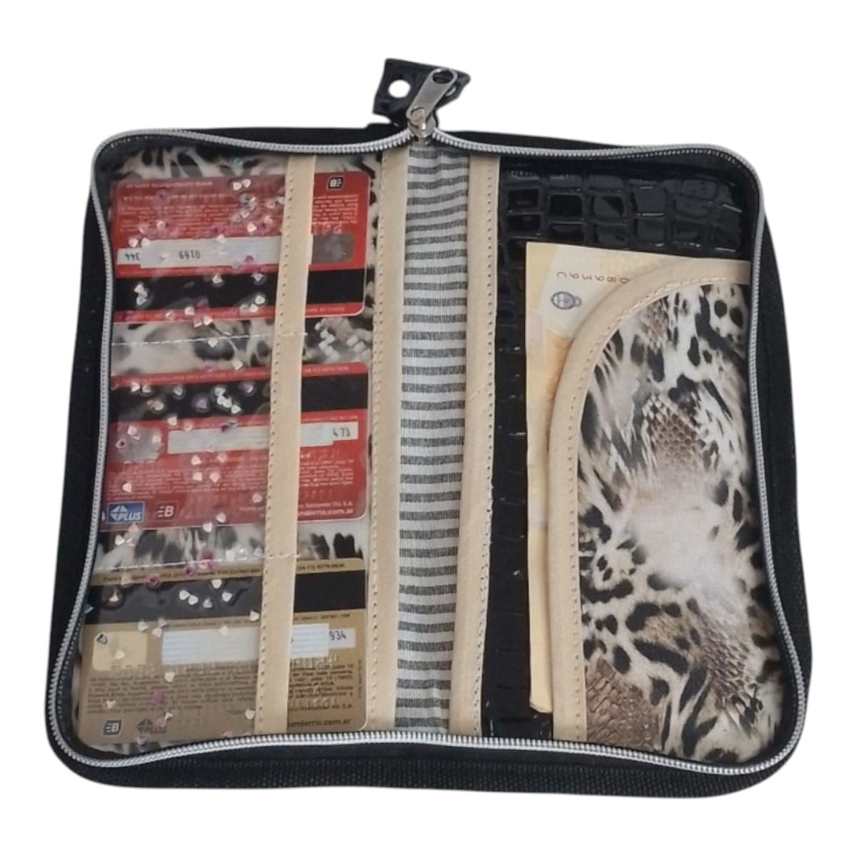 un producto hecho 100% artesanal cierra completamente para que nada se caiga más una solapa independiente para tarjetas y dinero